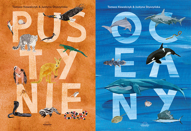 Dwustronny ilustrowany z malarskim rozmachem album dla miłośników przyrody, dalekich podróży oraz wszystkich, którzy lubią wiedzieć więcej. Kompendium wiedzy o wodach i pustyniach na Ziemi oraz zasiedlających je mieszkańcach. Album Pustynie Oceany to publikacja dwustronna, co oznacza, że można ją czytać od początku lub od końca. Piasek i woda spotykają się po środku książki. Ile jest tak naprawdę wody na Ziemi? Czym są kominy hydrotermalne? Jak zwierzęta morskie przystosowane są do życia? Które ptaki są na tyle wytrzymałe, by polecieć na drugi brzeg oceanu? I jakie dziwne stwory zamieszkują oceaniczne głębiny? Podróżując przez wszechocean czytelnik odwiedzi zarówno największe głębiny, jak i strefę pływów. Dowie się, czym są pelagial, estuaria i kominy hydrotermalne. Rzuci okiem na rafy koralowe i podwodne łąki. A także pozna mnóstwo niesamowitych stworzeń, które je zamieszkują – wszystkie mają szczególne umiejętności i dary, dzięki którym są naprawdę wyjątkowe i wszystkie tworzą łańcuch pokarmowy, dzięki któremu w środowisku morskim panuje równowaga. Jak powstają pustynie? Czym się charakteryzują? I jak ich mieszkańcy przystosowani są do życia w tak ciężkim klimacie? I czy naprawdę istnieją śpiewające piaski? Opowieść o pustyniach wyjaśnia, w jaki sposób powstają, w jakich miejscach na Ziemi się znajdują oraz czym charakteryzują się tereny pustynne. To ciekawe tym bardziej, że pustynia wcale nie oznacza morza piasku, na którym co jakiś czas znajdują się wydmy, jak mogłoby się wydawać. Rodzajów pustyń jest naprawdę wiele, a natury nie da się tak łatwo zaszufladkować. Na wszystkich jednak panują wyjątkowo trudne warunki do życia. Dlatego zwierzęta, które je zamieszkują, mają wielce ciekawe tajemnice i zwyczaje! Zapraszamy na wyprawę do najdalszych i najbardziej niedostępnych zakątków Ziemi. A nawet dookoła świata.